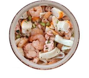 La nostra insalata di mare è un omaggio al mondo sottomarino, preparata esclusivamente con prelibatezze marine di prima qualità. Troverete mazzancolle, anelli di polpo, surimi di gamberi e croccante sedano bianco. Questi ingredienti sono selezionati con cura per garantire una freschezza e una qualità superiori.